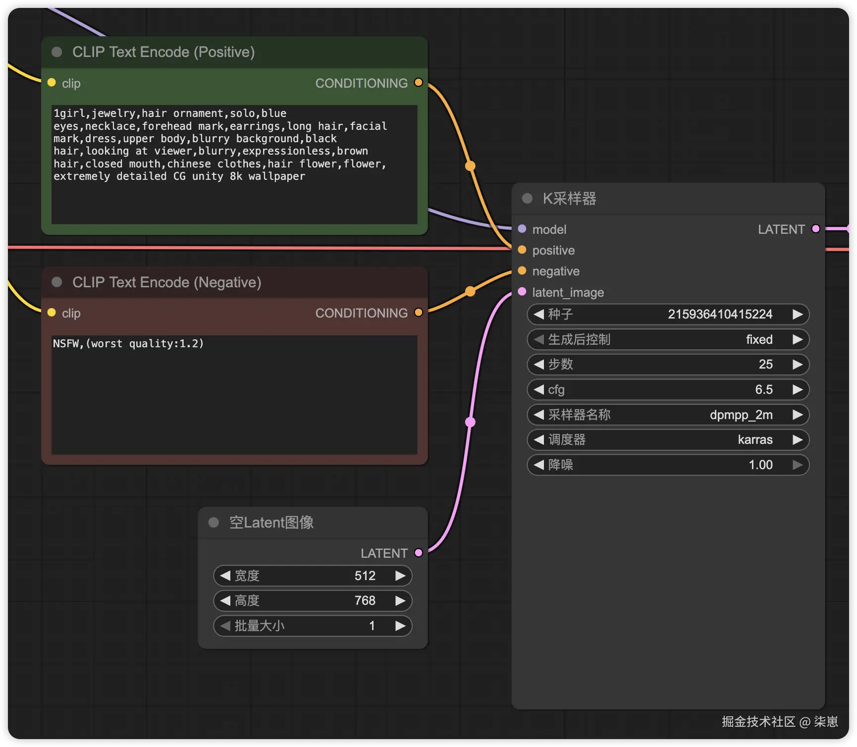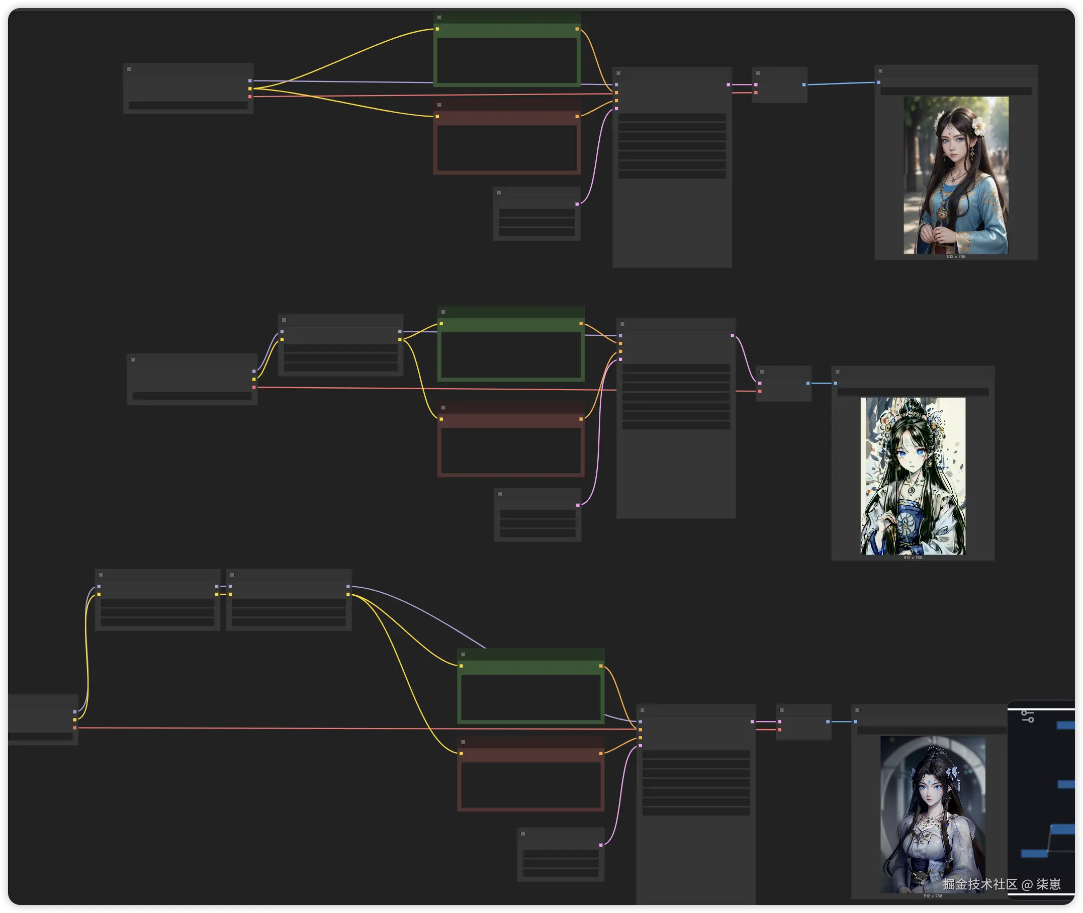 所以它生效的地方就在大模型后面,如下图,在checkpoint的MODEL输出后面,就可以插入LoRA,多个LoRA可以以此叠加。