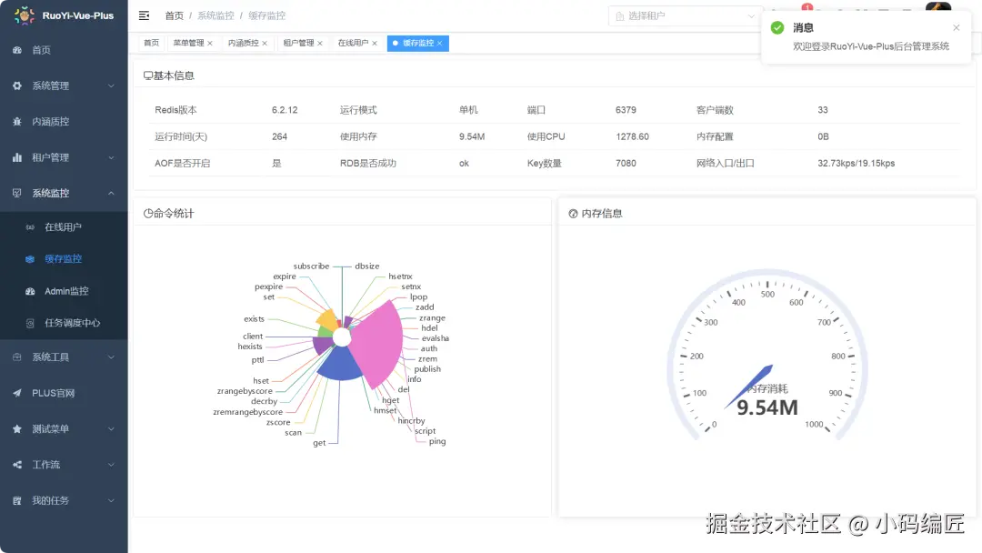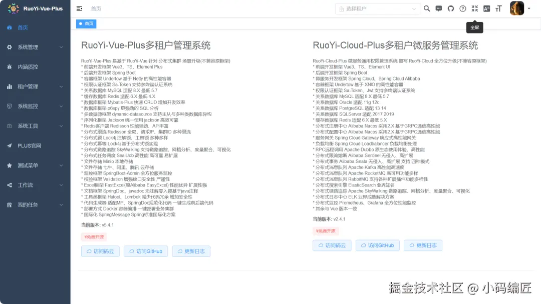 包括用户管理、角色权限、部门岗位、菜单配置、租户管理、操作日志、文件存储、定时任务、代码生成器等,支持多数据源切换、动态授权登录、在线用户监控和系统服务监控,满足企业级系统的通用需求。