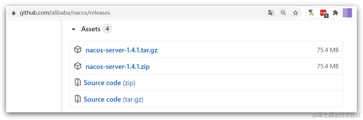 在Nacos的GitHub页面,提供有下载链接,可以下载编译好的Nacos服务端或者源代码: