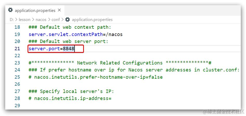 如果无法关闭占用8848端口的进程,也可以进入nacos的conf目录,修改配置文件中的端口: