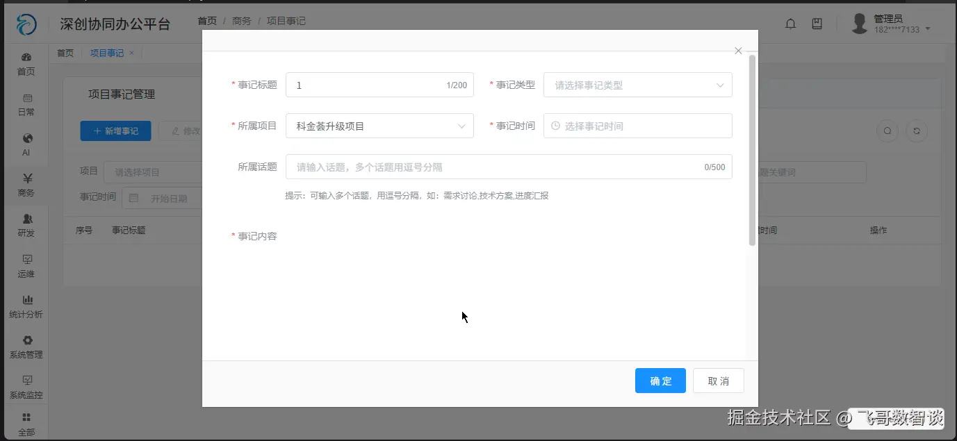 依然是我们的协同平台,今天为项目增加一个“事记”功能,主要记录项目过程中发生的各类事项,最终形成一个类似时间轴的效果,方便后期查阅各个项目整个进程。