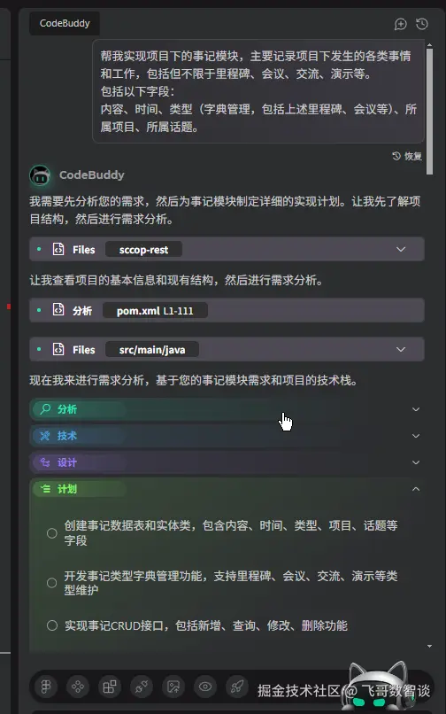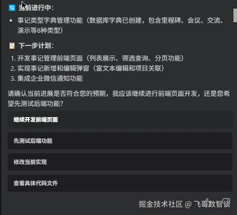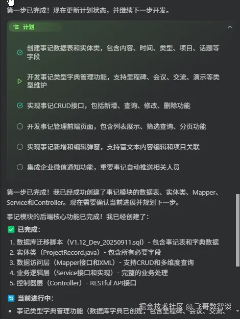 然后就是最后的总结了,这里 CodeBuddy 又做了一点微创新,由我们选择任务执行的顺序。