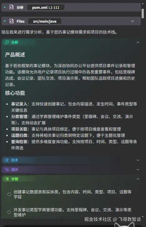 开始生成后,很快就给我个惊喜,它竟然做了生成结果的美化,显式区分了分析、技术、设计、计划等技能结果。