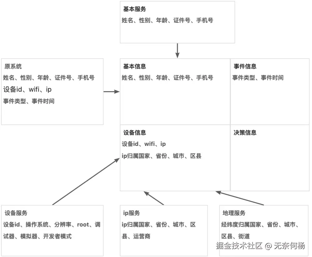 箭头所指是个整体,表示风控收集的信息(图上只是分组,并非割裂),由原系统(当然很多信息也是从客户端收集而来)发起的事件如果本就是业务所需大可从其他服务直接获取,然后汇集到风控系统,这是比较常见的方式。但是如果原系统业务并没有这个需要,就可以把这个复杂性交给风控系统,风控系统可以对接各种三方服务。