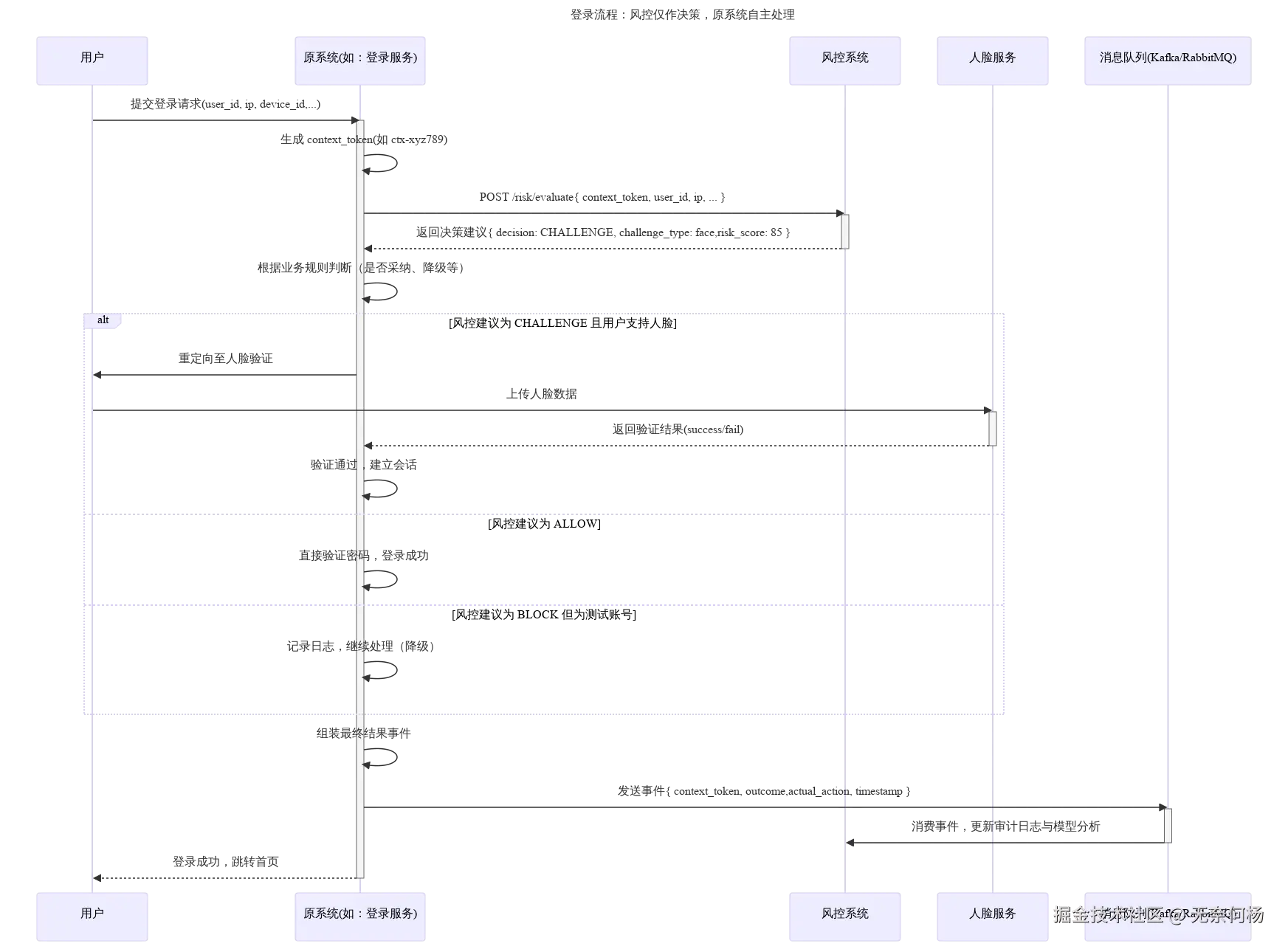 如图,展示了简易的登录流程,在原系统和风控系统交互时自己维护了一个上下文保存当次事件的信息,维护的主要目的就是为了解决在登录完成后反馈到风控系统时省去重复组装数据的步骤。当然如果整个流程中不会中断,那么上下文的意义好像也不是很大,但不可避免的会有中断,增强验证等等情况,这时上下文就比较有用了。