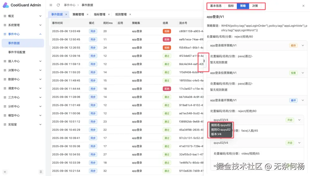 事件详情优化,头部不随滑轮滚动,侧边增加关闭按钮,指标、策略集、策略、规则增加tooltip和快捷跳转