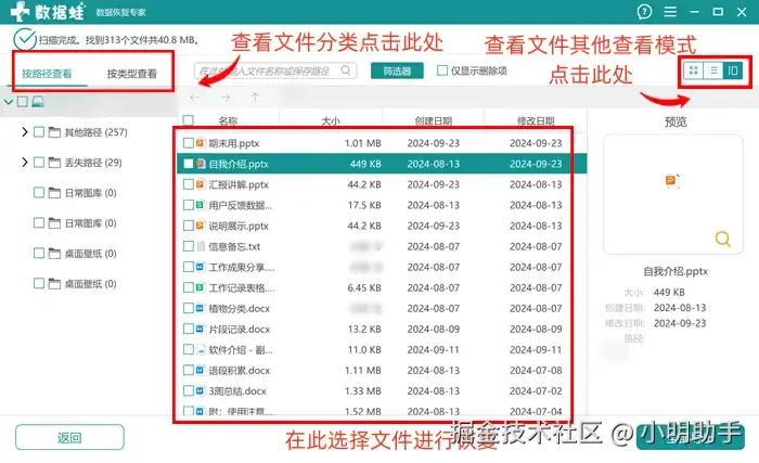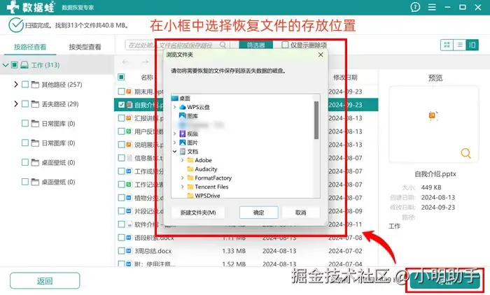 使用左木数据恢复专家,我们同样需要在扫描准备页面中选择目标数据的类型,之后在软件的扫描结果中选择需要恢复的文件,最后选好存储路径,完成文件恢复。