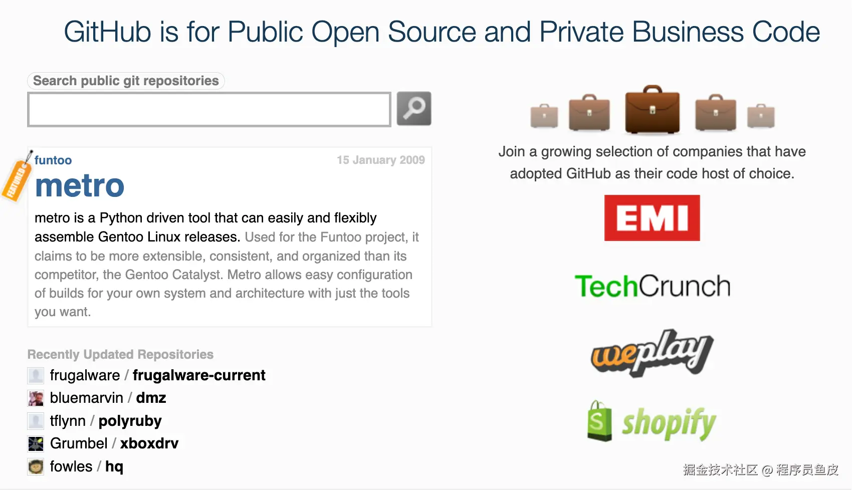 2009 年,GitHub 留了很大一块区域给品牌宣传,展示了已经采用 GitHub 作为首选代码托管平台的公司。