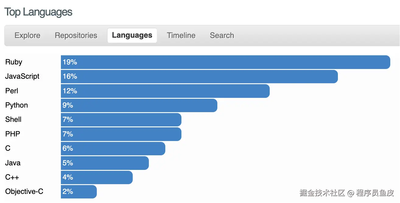 从 2010 年的语言统计来看,Ruby 和 JavaScript 应该是当时最受欢迎的编程语言,还有一些语言也初露锋芒,Java 那年还只是个小卡拉米。