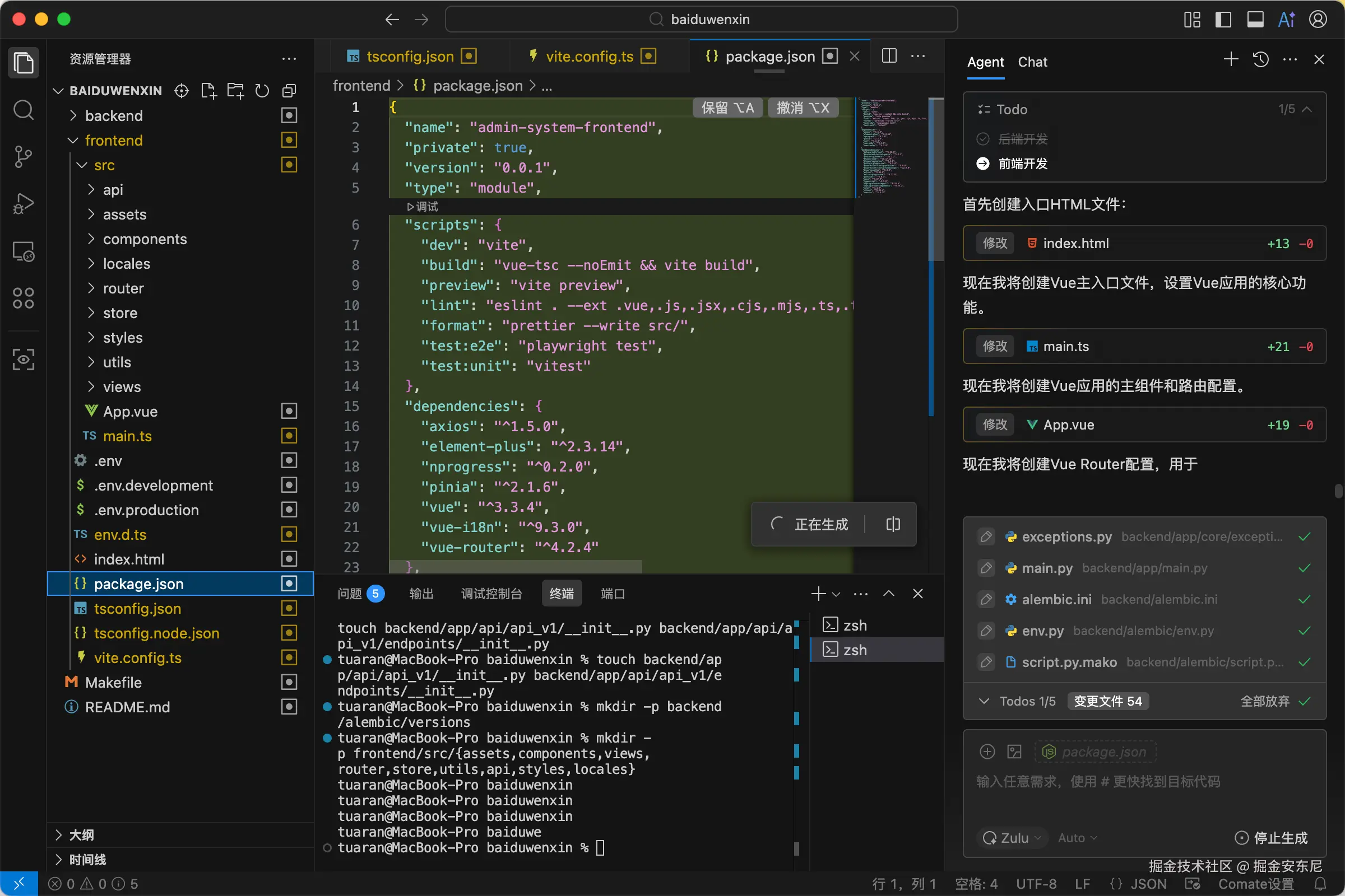 请帮我从零创建一个前后端分离的管理系统:前端用 Vue 3 + Vite + Vue Router + Pinia + Element Plus(支持登录/退出、侧边菜单、面包屑、列表分页筛选、表单增删改查、上传/导出、深浅色与中英国际化),后端用 Python FastAPI + SQLAlchemy + Alembic + JWT(提供