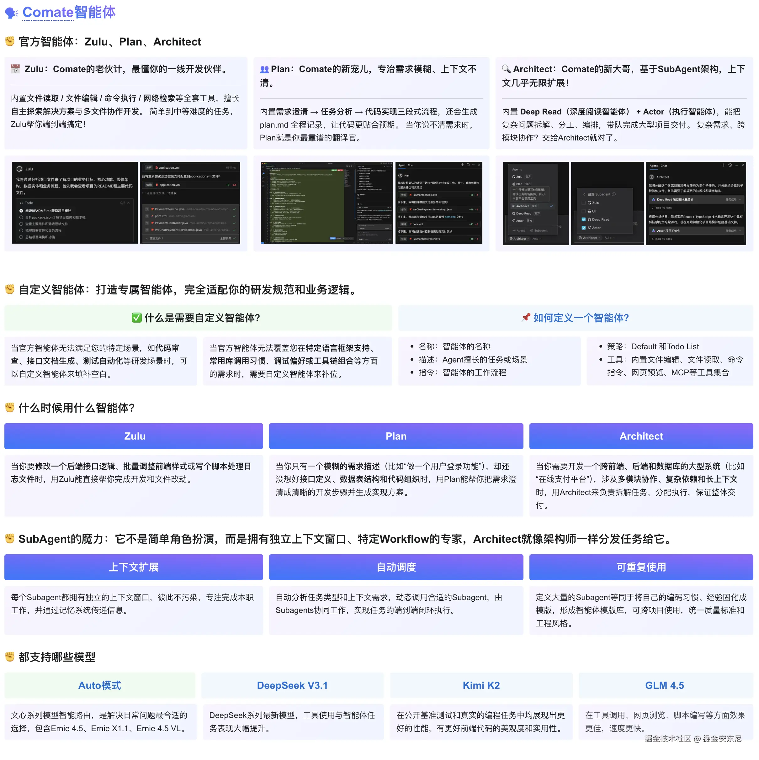 并且,这些智能体各自互相协同,这不再停留在“设个角色、挂个知识库”的浅层集成,而是把工作流程编排进去:每个子智能体既具备专业域知识,又保留通才能力(跨栈理解与补全上下文、接口对齐与冲突消解),达成真正意义上的协作。
