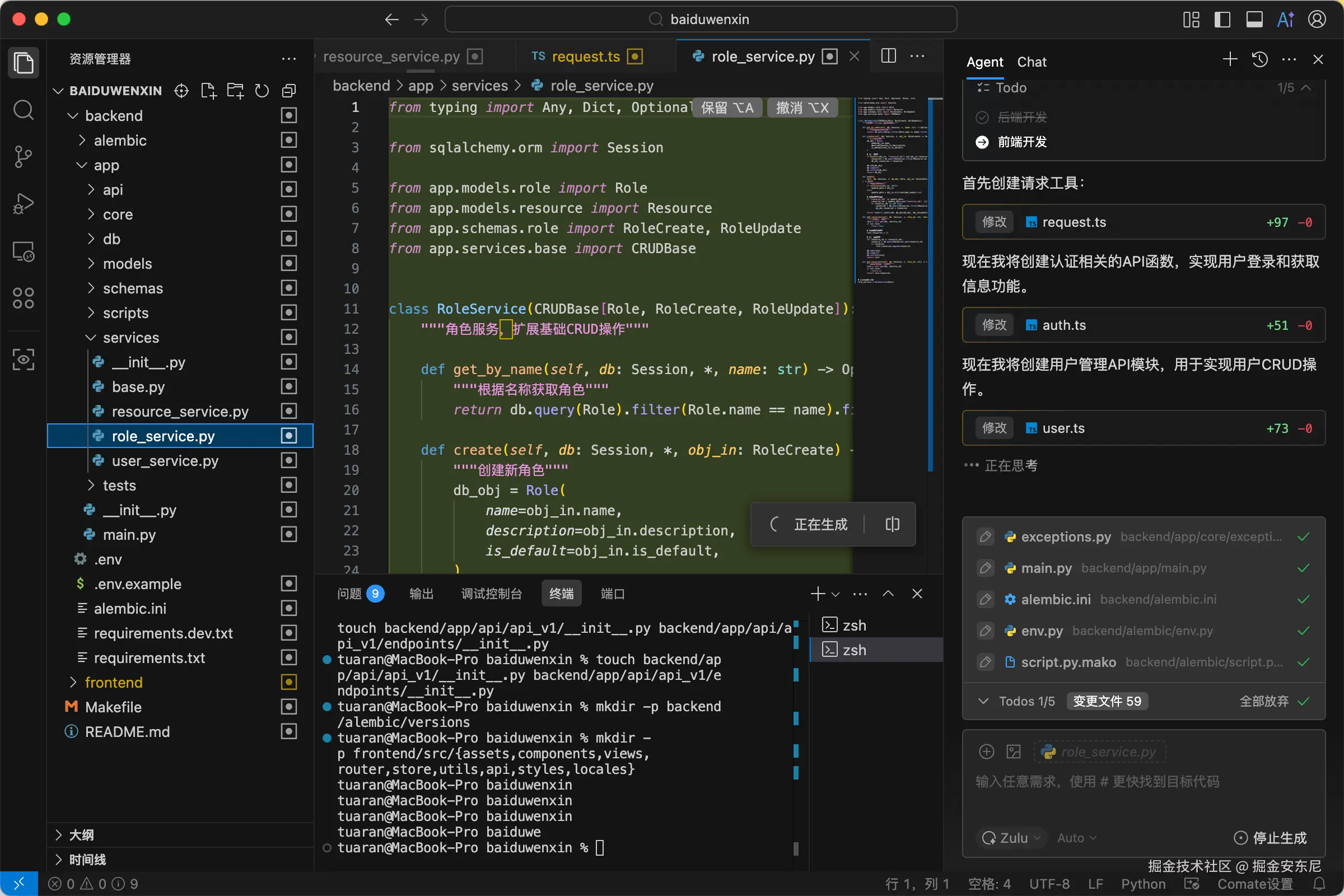 /auth/login、/users、/roles、/resources等 REST API,含分页/排序/搜索、RBAC 鉴权、中间件日志与异常处理、Swagger 文档,数据库默认 SQLite 并支持切换 PostgreSQL),两端通过.env可配置,提供 Docker Compose 一键启动(frontend:5173、api:8000)、种子数据与管理员账号(admin/123456),内置单元测试与接口测试样例(pytest + httpx)、前端 e2e 示例(Playwright),并生成 README 与脚手架脚本(make dev本地启动、make test测试、make build产物构建)。