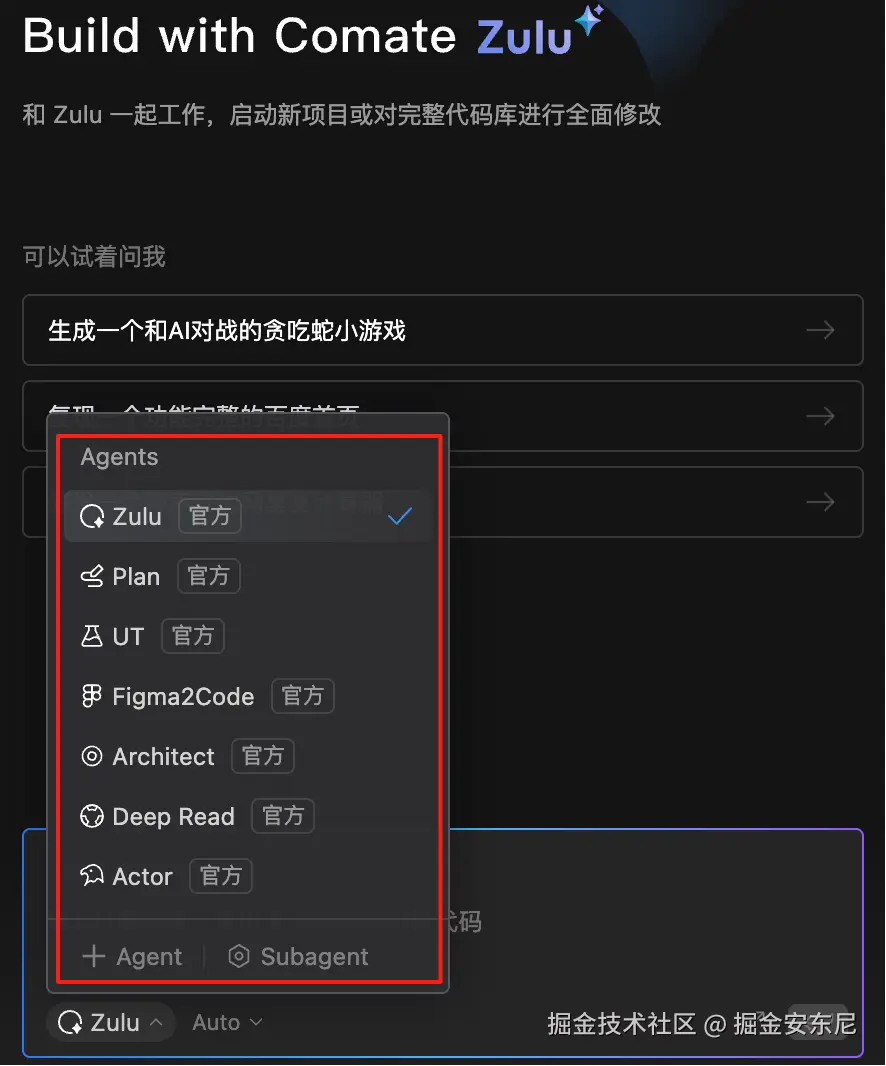 | Zulu | 启用所有内置 Tools 和当前项目安装的 MCP 工具,擅长自主探索用户需求、完成多文件编辑、端到端完成任务。 | 代码结构复杂、文件改动量大的需求。 |
