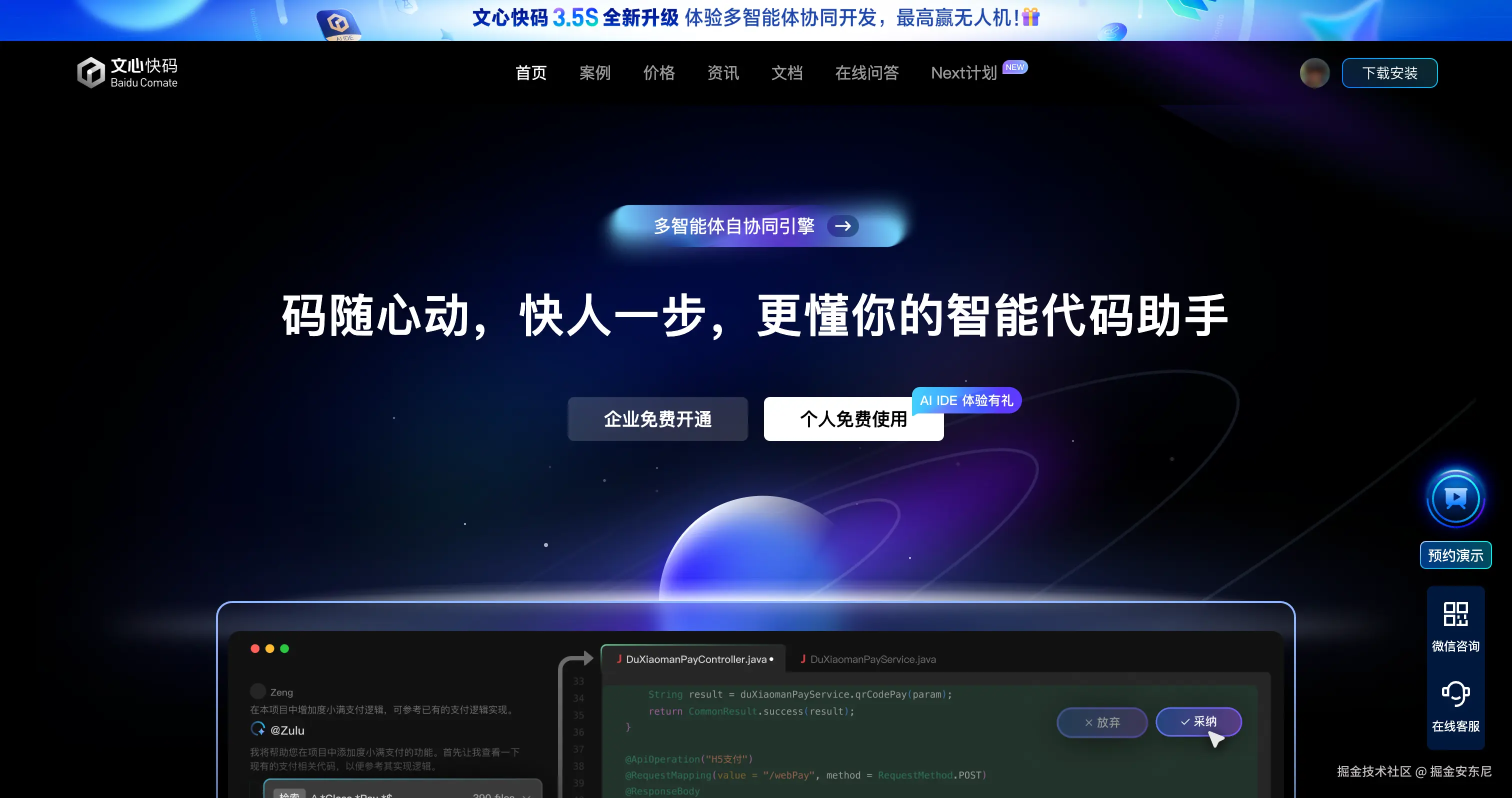 9 月 9 日,在 Wavesummit 开发者大会上,百度正式发布 文心快码 3.5S(Super Synergistic AgentS)版本。