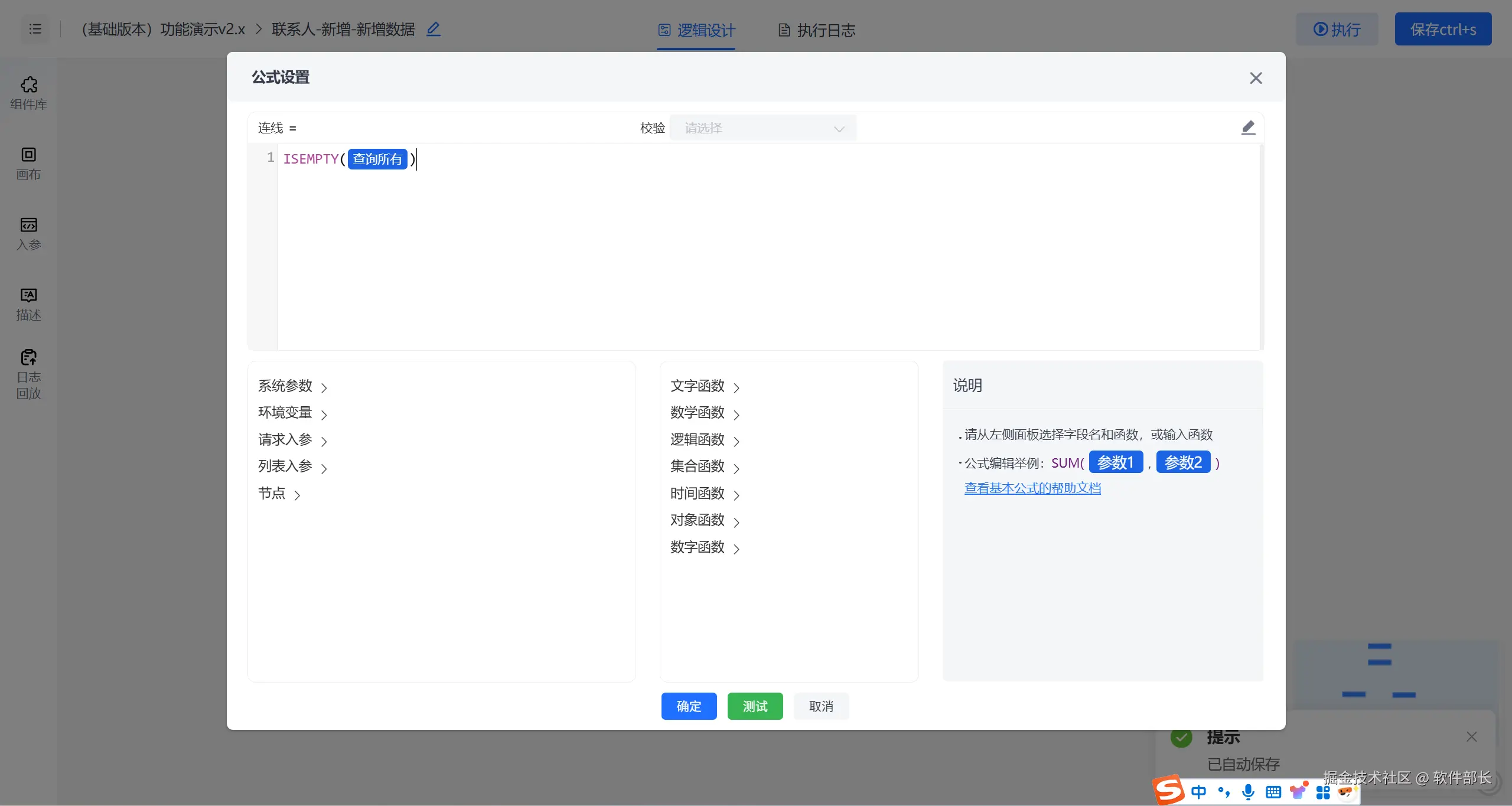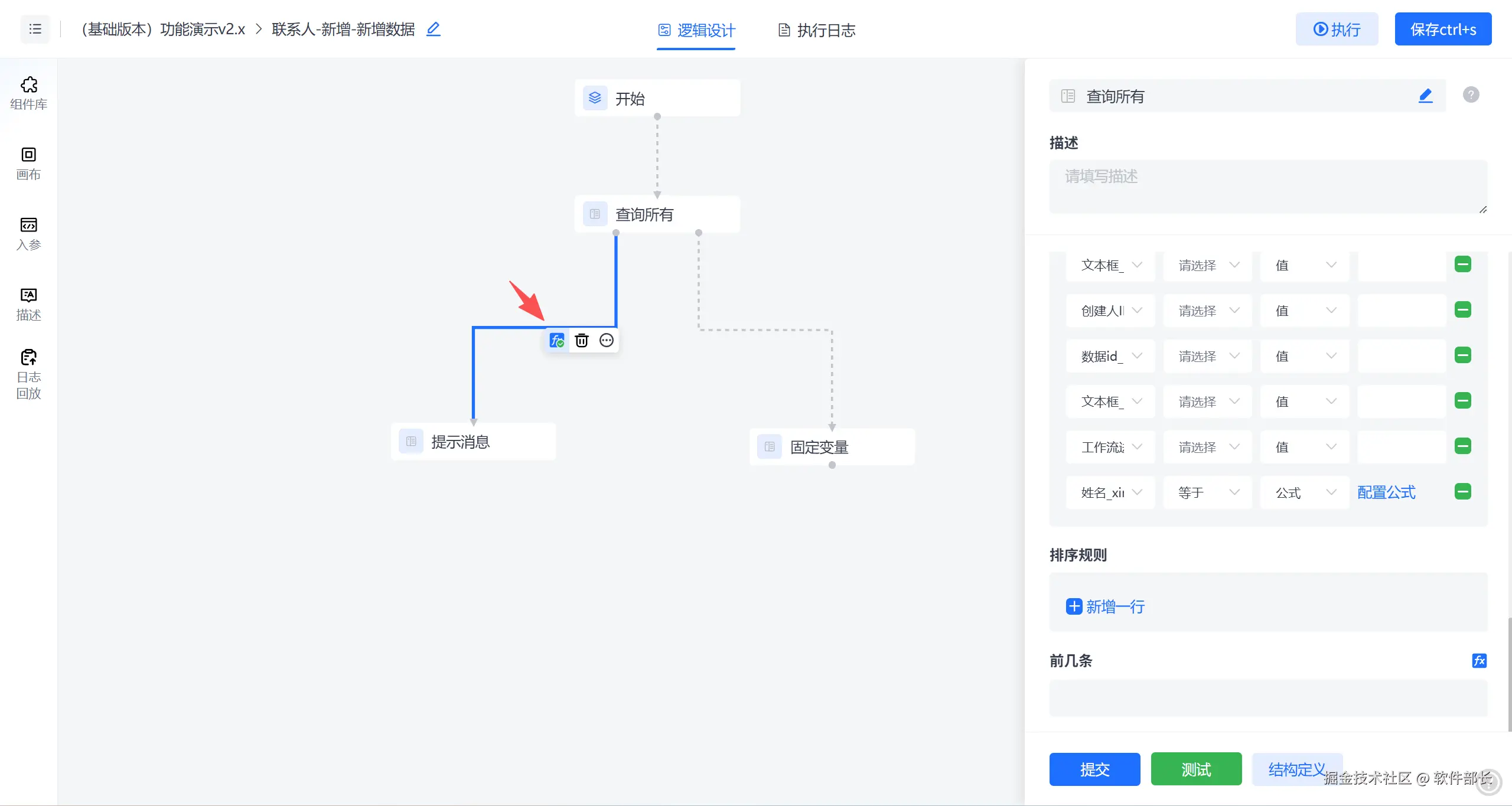 然后在与【提示消息】和【固定变量】节点连线上分别配置函数公式判断【查询所有】节点是否有值,如下图