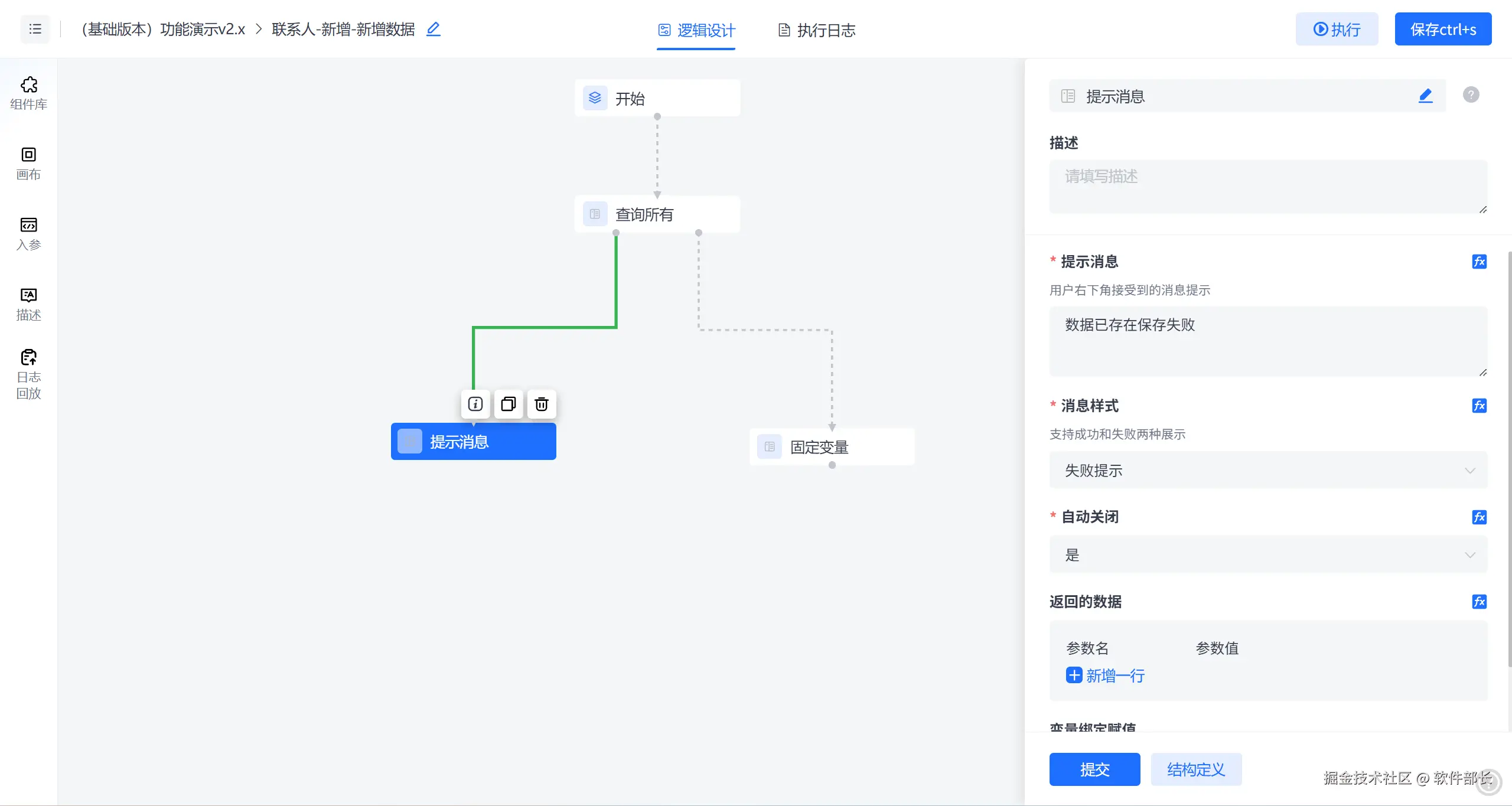 最后保存逻辑,开启事件保存设计,回到列表页,新增数据填写信息,点击提交看到效果如下
