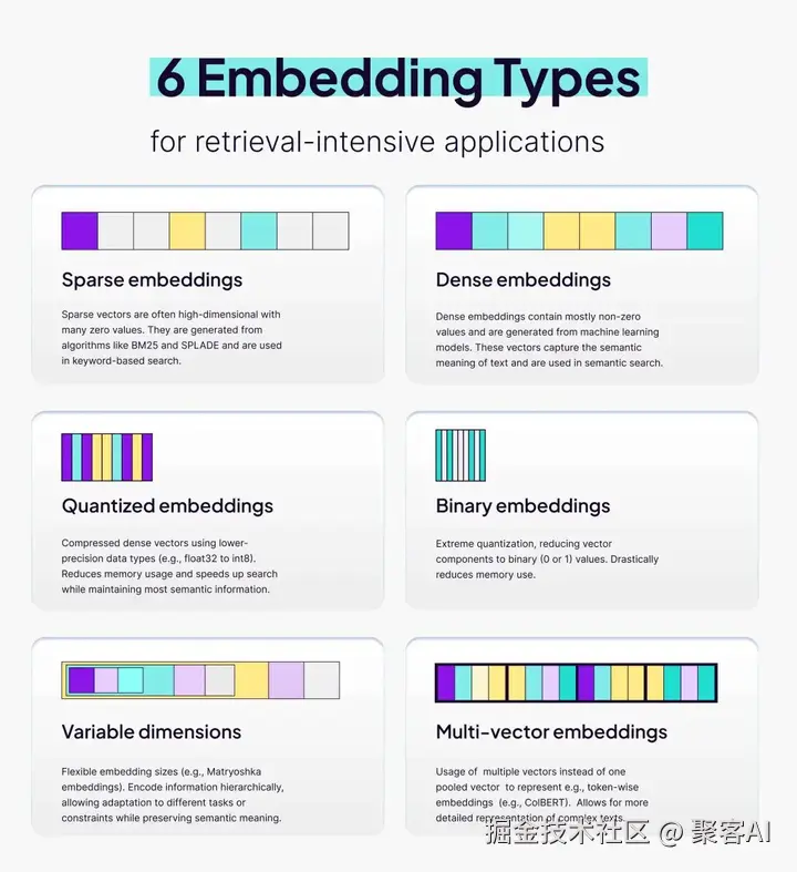今天我将系统解析七种主流嵌入技术,包括 Sparse Embedding、Dense Embedding、Quantized Embedding、Binary Embedding、Matryoshka Embedding 以及 Multi-Vector 嵌入方法,并提供实用选型建议。