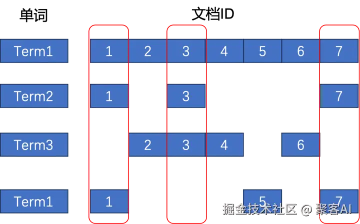 以下图的这个简易倒排索引所示,我们按照列为单元来看倒排索引,那么每列就可以表征为一个文档所包含的单词列表,这其实就是一种稀疏向量。图中的 3 个红色框分别代表了文档 ID 为 1,3,7 的三个不同的稀疏向量。而倒排索引则提供了稀疏向量的高效检索方式。