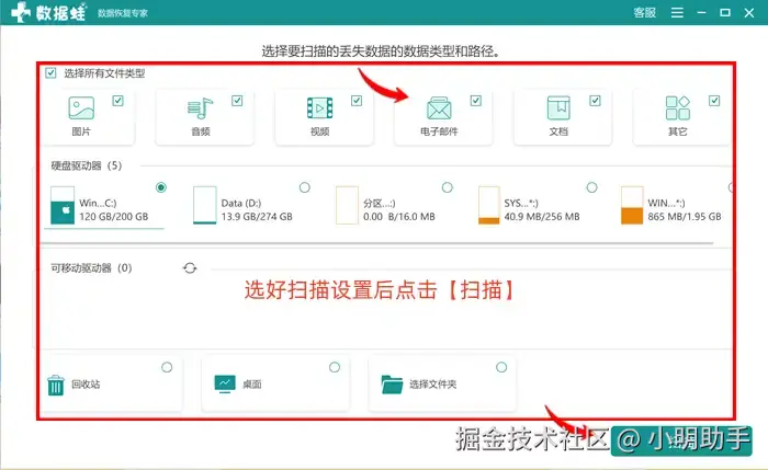 - 扫描范围广泛: 不论是电脑内部硬盘,还是外部存储设备,我们都可以使用数据 蛙恢复专家尝试找回我们丢失的文件。