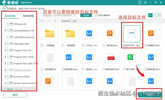 步骤2: 等待软件进行文件的扫描,在左上角显示【扫描完成】后,我们就能在指定的位置选择文件进行恢复;勾选后点击【导出】按钮,就能让文件恢复回来了;