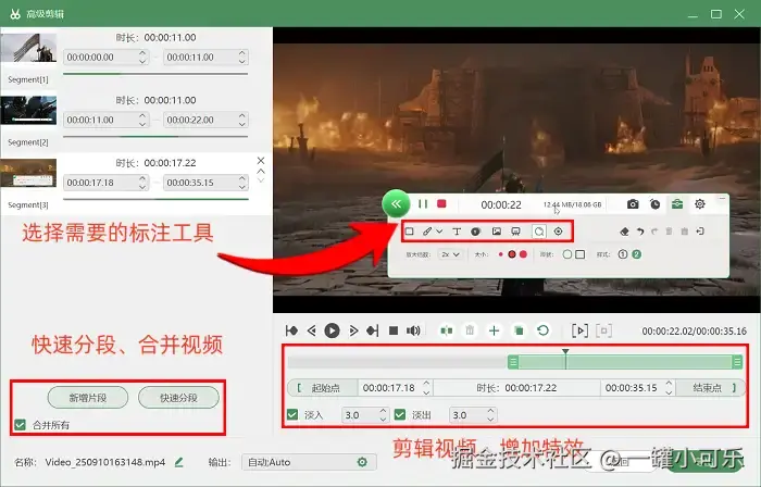 步骤3:在录制的时候,你可以用各种标注工具,如放大镜等,突出视频重点。等录完了,你可以打开 “高级剪辑” 页面,用里面的快速分段工具把视频分成几段,还能给视频加点转场特效啥的。