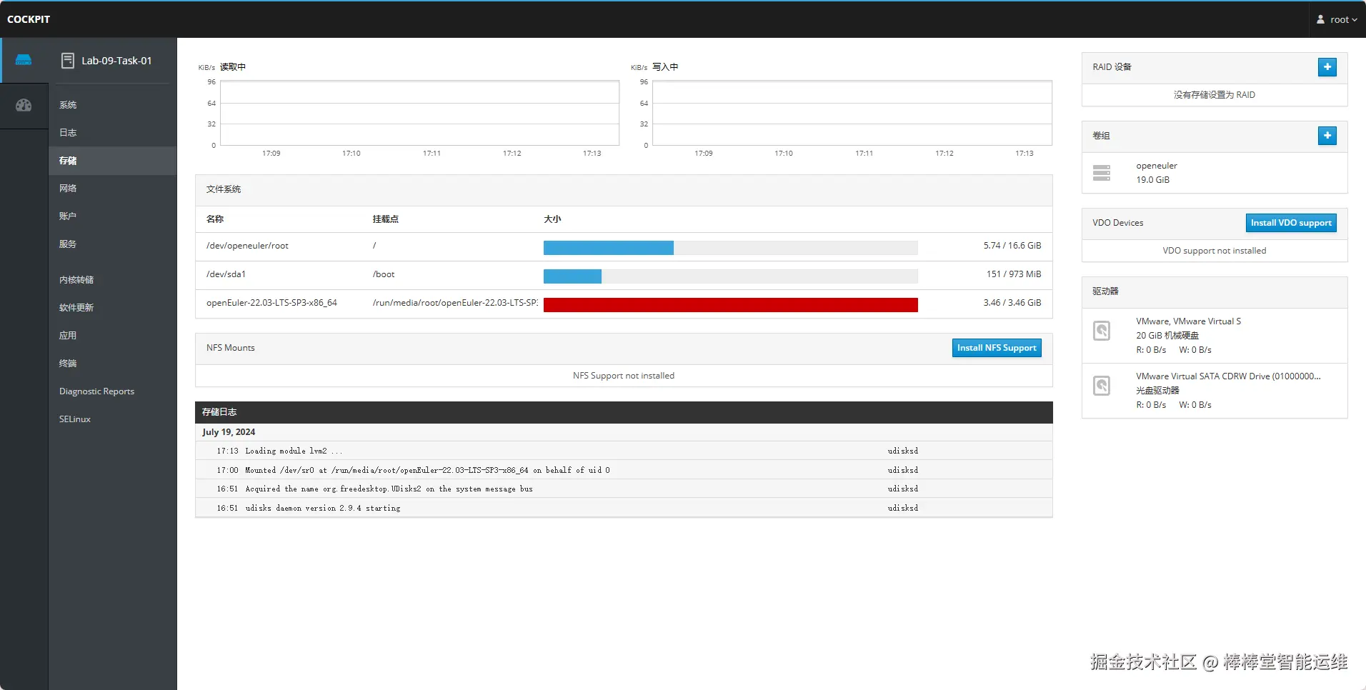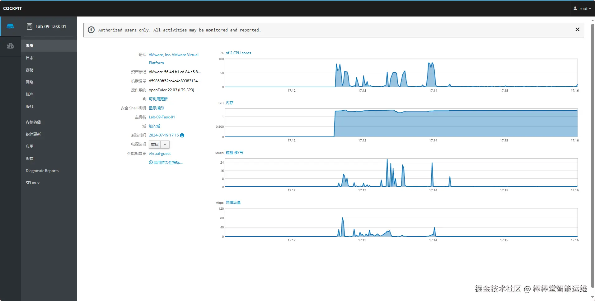 登录Cockpit之后将展示系统的概览信息。通过该页面可以查看操作系统的版本信息、系统时间、CPU、内存、磁盘 I/O 以及网络流量等情况,如图9-1所示。