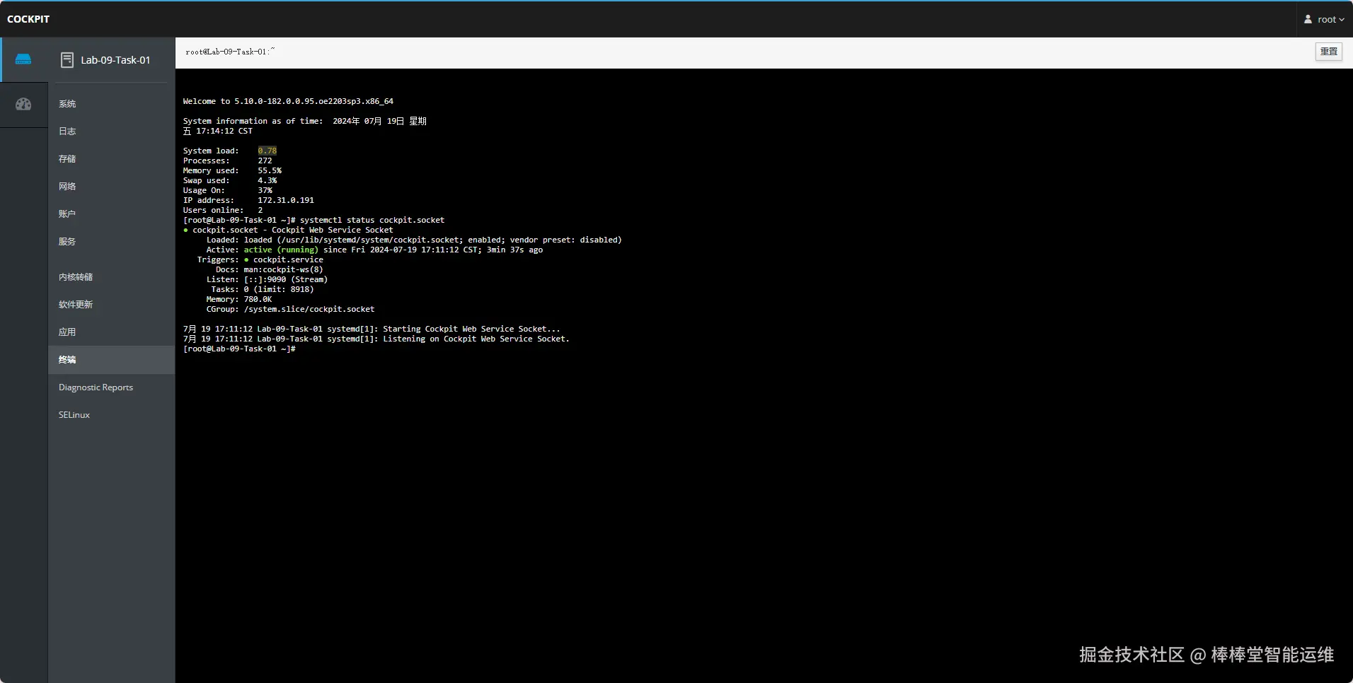 无须SSH客户端软件,通过Cockpit终端可对操作系统进行终端操作。单击左侧导航中的“终端”选项,进入系统终端界面,输入命令查看Cockpit服务状态,如图9-6所示。