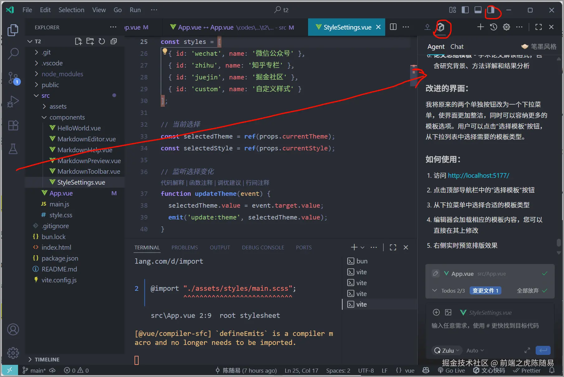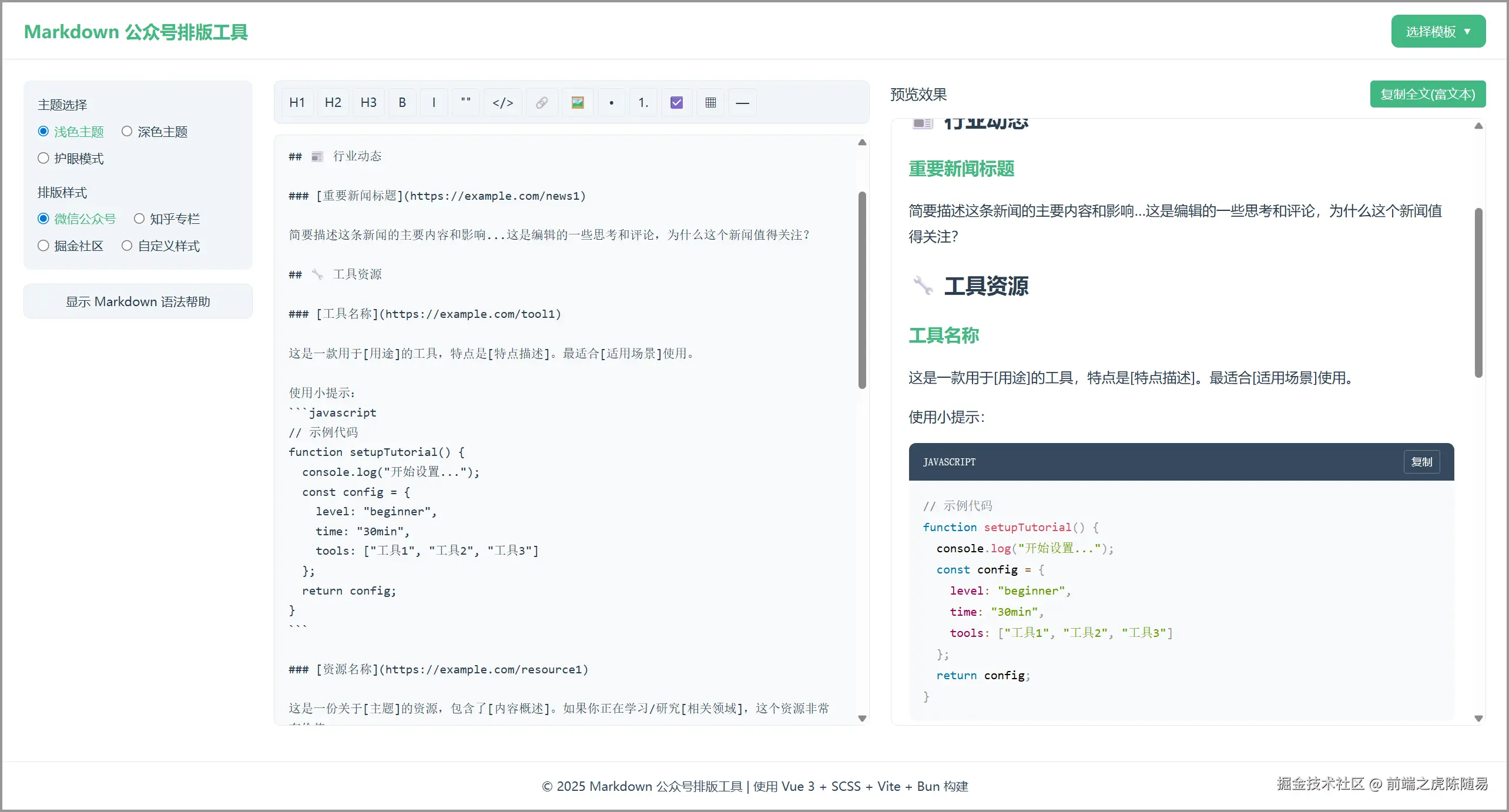 写一个网页版 markdown 公众号排版工具,要求用 vue3+scss+vite 实现,不要用任何 UI 框架,不要用 nodejs npm pnpm 来运行和安装依赖,全部用 bun 来运行和安装依赖,不要自行测试,运行脚本命令,由我自己来手动运行看效果。请提供合理的布局,至少有一个 markdown 源码视图,有一个 markdown 渲染视图,可以选择多种排版方案和主题,至于具体的排版,设计等,你自己根据理解判断吧,一定要界面美观,优雅,体验良好,操作方便,开始吧。