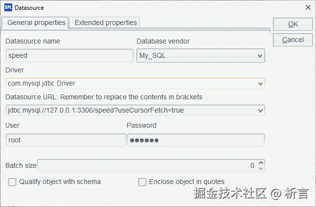 在 esProc 中建立 MYSQL 数据源,菜单栏选择 Tool-Connect to Data Source,配置 MySQL 标准 JDBC 连接,名字是 speed: