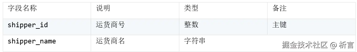 运货商表 shipper,存储线下运货商数据,数据量较小: