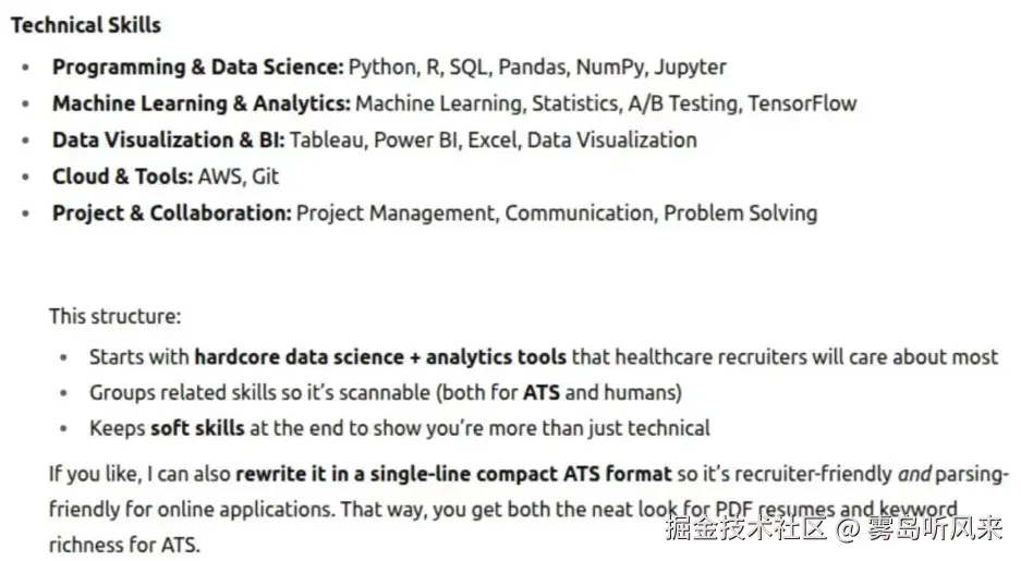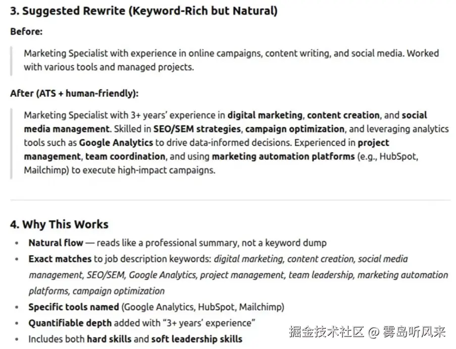 - **为何有效:**确保简历与职位描述采用相同的表述方式,从而增加通过ATS筛选的机会。