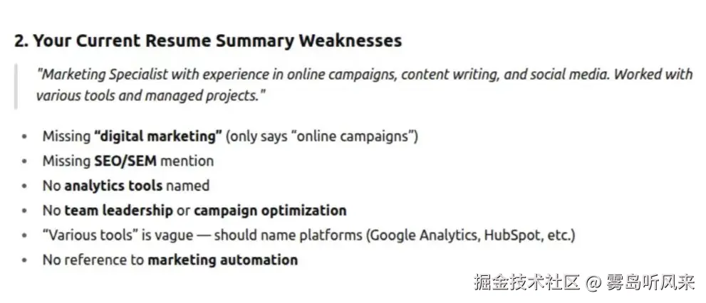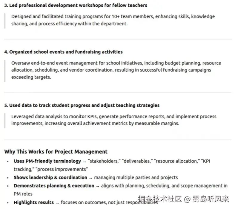 - **为何有效:**这一提示促使求职者超越职责描述,思考其实际工作中的成就,而这正是招聘方最关心的事项。