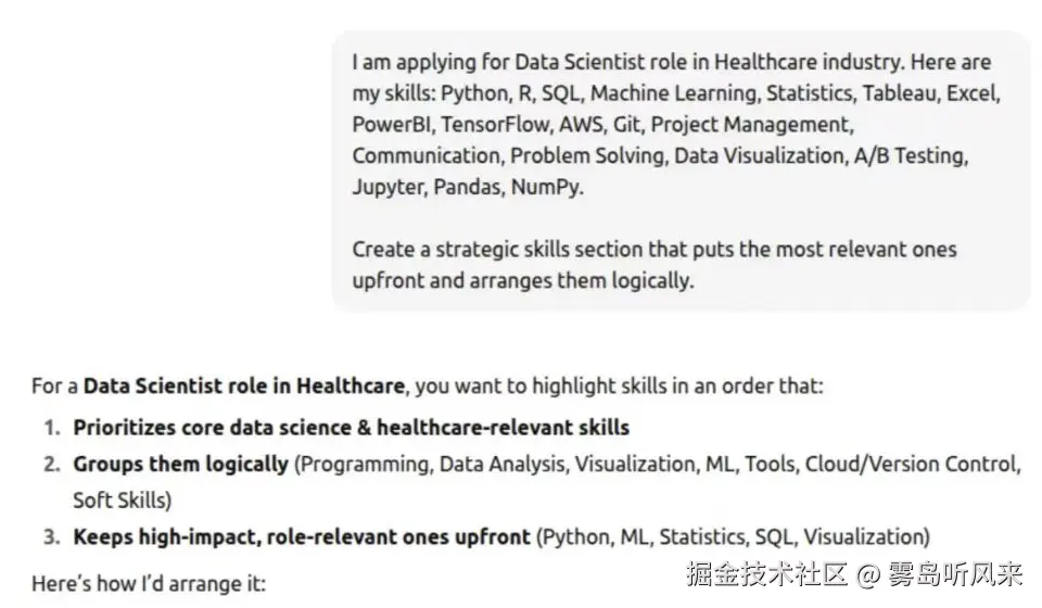 提示:“分析这份职位描述:[粘贴职位描述内容]。现在查看简历部分:[粘贴相关简历部分]。建议如何将职位描述中最重要的关键字自然地融入简历,避免关键字堆砌。重点关注职位描述中提到的技能、技术和任职资格。”