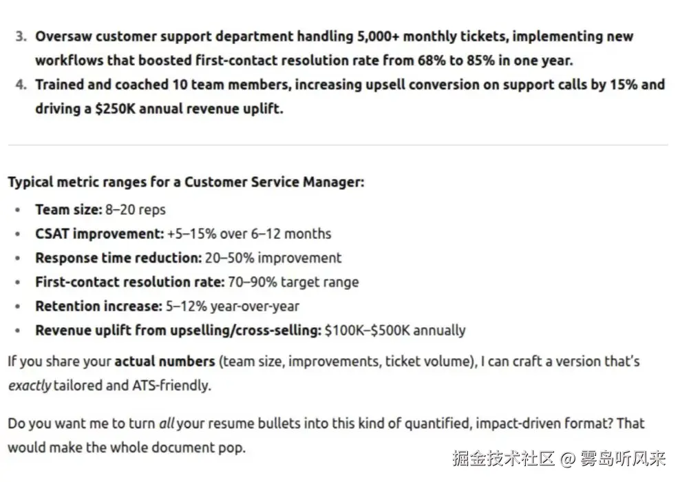 **转换之后:**领导了一个12人的客户服务团队,将响应时间缩短了40%,并将客户满意度从3.2分提高到4.7分(满分5分)。