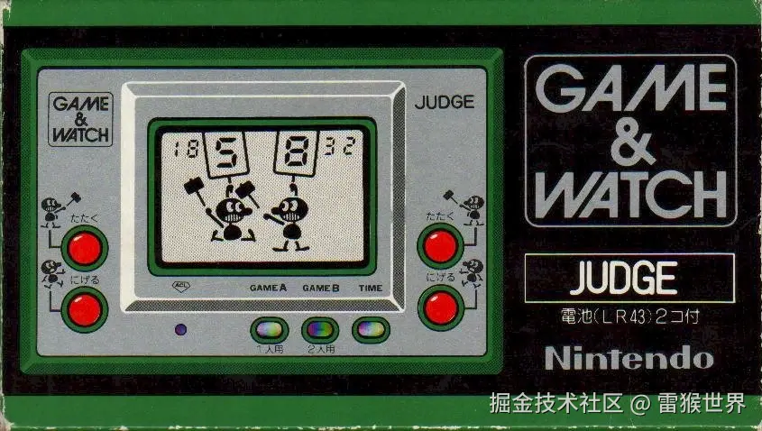 1980年10月4日推出《JUDGE》,同样卖5800日元,但这款是首款可以双人对战的Game&Watch。根据屏幕展示的2组数字的大小决定是使用攻击还是防御,有趣性非常大。当然也可以单人游玩,单人游玩的情况下就是和电脑对战了。