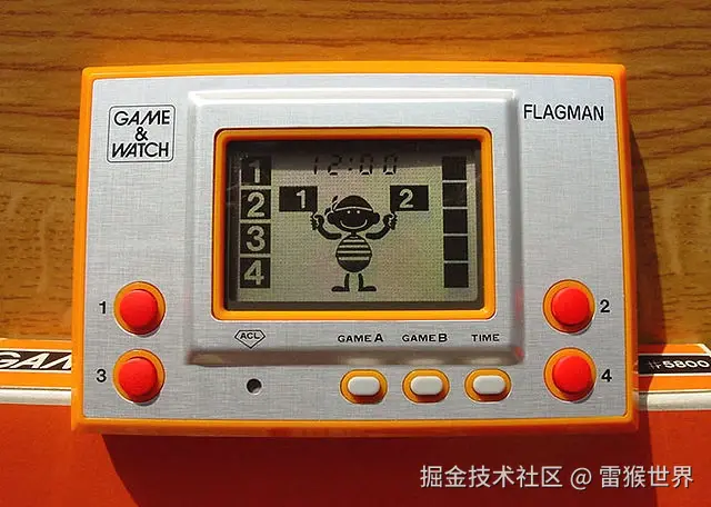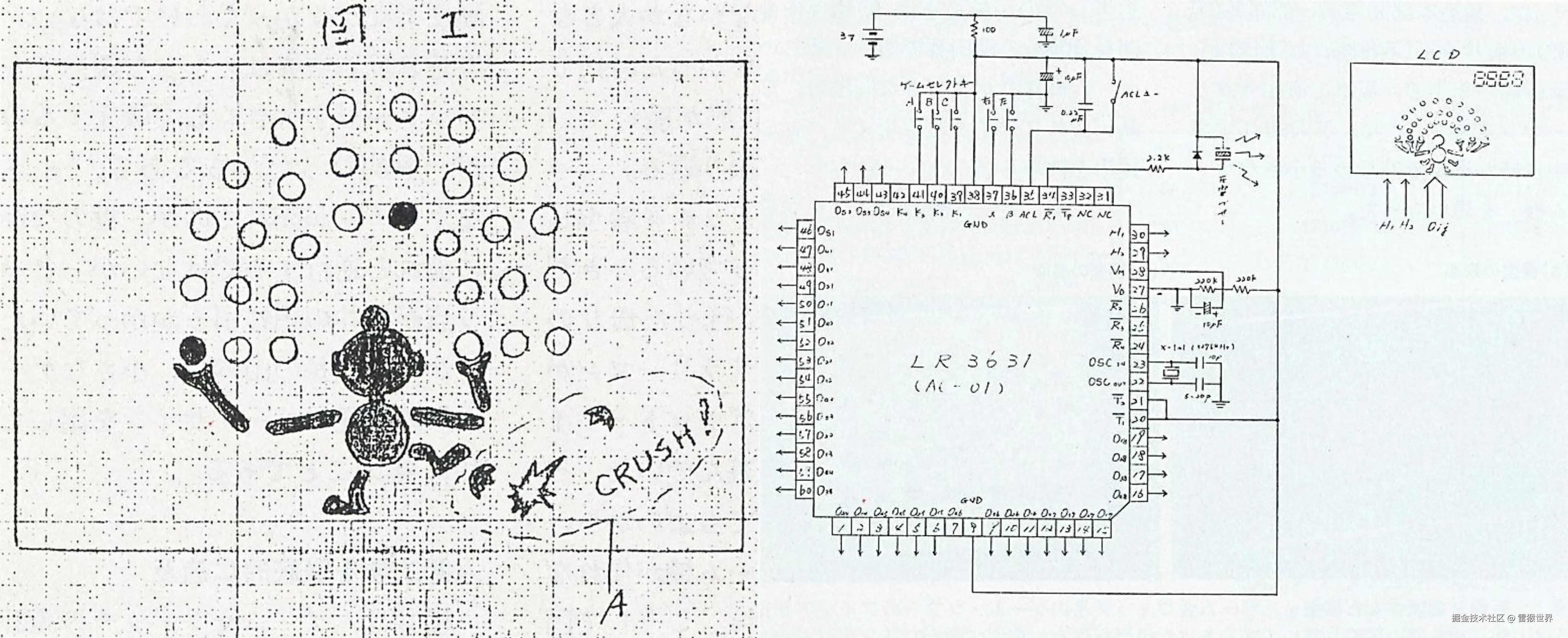 画面里有一个小人,玩家需要看准时机按左右两边的按键接球。其实Game&Watch的技术非常简单,玩过计算器的朋友都知道计算器屏幕能显示的内容是有限的,简单来说就是提前写死了一些内容在屏幕里,要显示什么内容就通过背后的“电脑”控制。Game&Watch也用了同样的工作原理,提前写死了一些图案在LCD屏幕上,通过程序让固定图形闪烁从而营造出图形在移动的错觉。