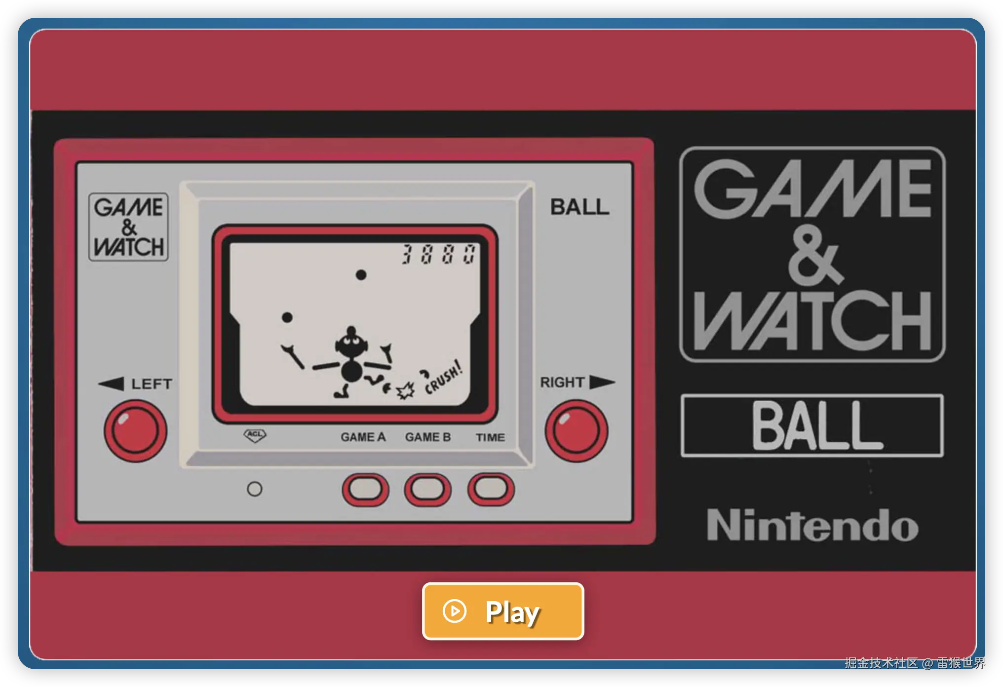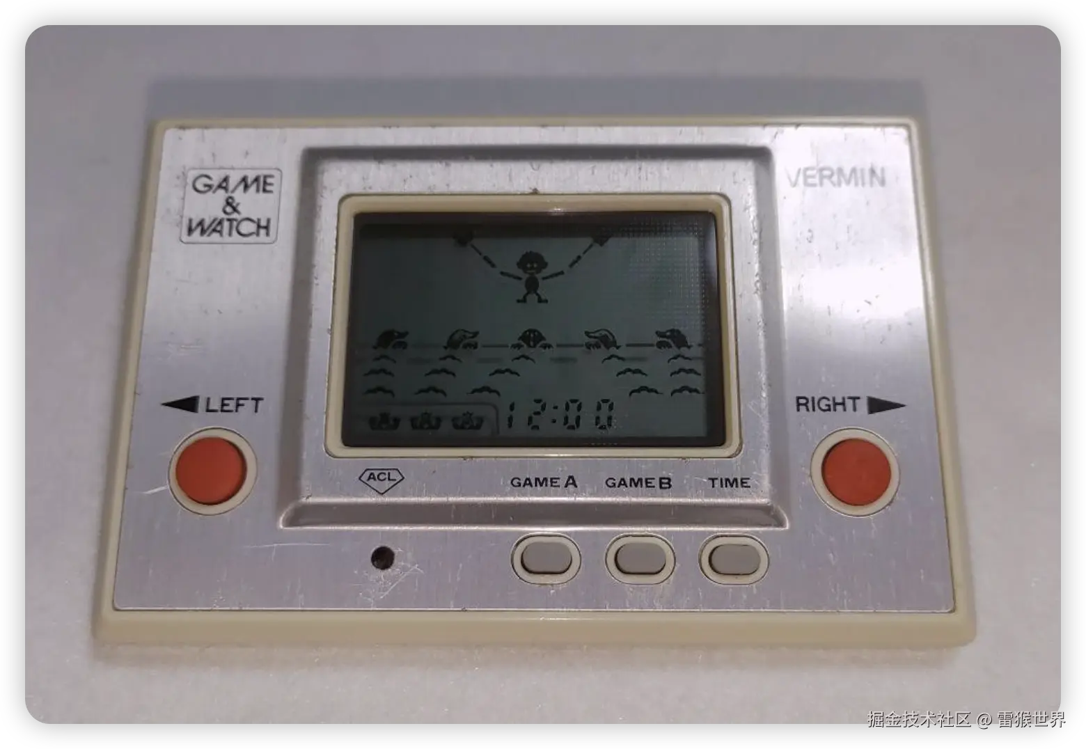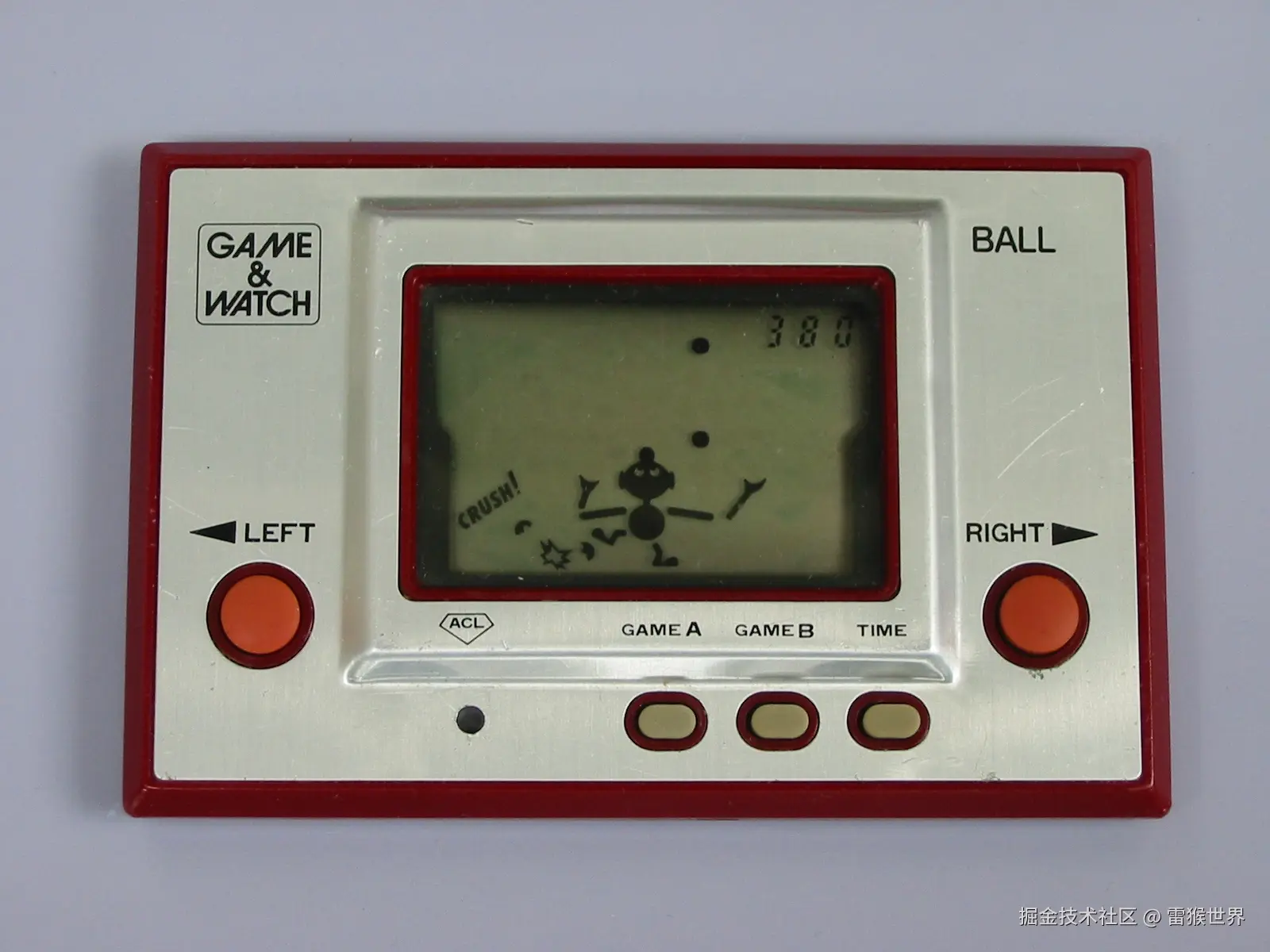 第一款Game&Watch叫《Ball》,中文名叫《抛接球》,型号AC-01。屏幕的展示效果和我们今天看到的计算器屏幕差不多。游戏是跟游戏机绑定的。机身正面有几个按键,左右两个红色按键用来控制小人作用移动,屏幕下方的“GAME A”和“GAME B”是两种不同的游戏难度。按下“TIME”键可以展示时间。