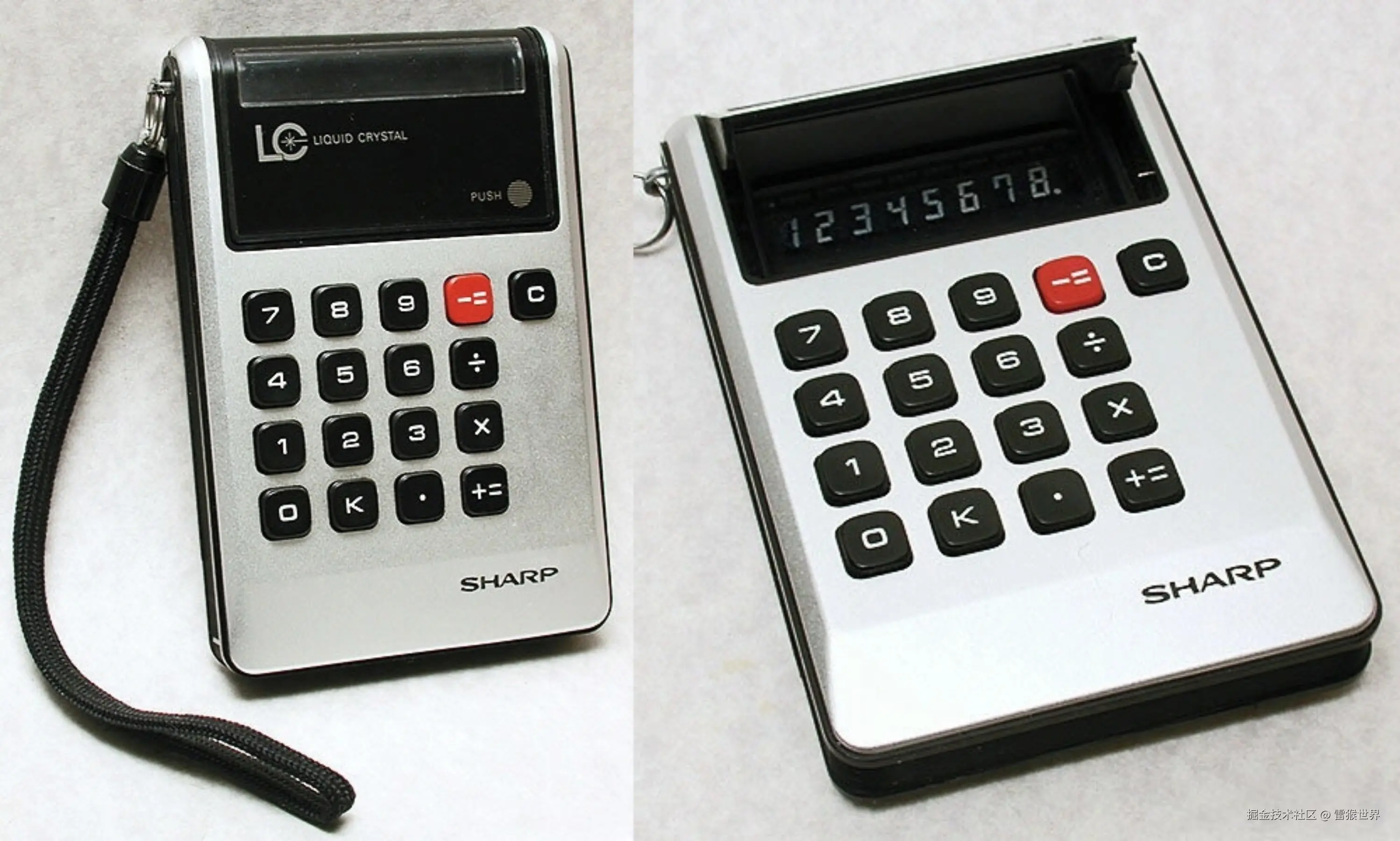 60年代出现了电子计算器,当时做电子计算器有“四大家族”,卡西欧、夏普、惠普、德州仪器。到了70年代卡西欧和夏普打得最凶。1973年夏普推出了全球首款使用CMOS-LSI的计算器——SHARP EL-805。简单来说就是全球第一台手持式液晶显示计算器,显示器用的是液晶显示屏(LCD)的电路是玻璃。