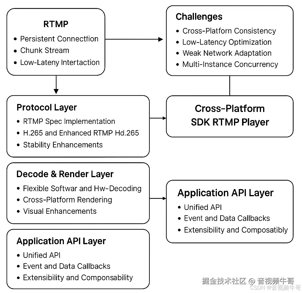 大牛直播 SDK RTMP 播放器正是基于这一坚实底座,通过 全自研跨平台内核 实现: