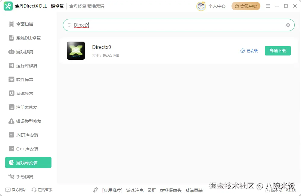 操作说明:选择“游戏库安装”,搜索需要恢复的组件名称,例如“DirectX”。在软件提供的组件库中,点击下载并安装该组件即可。安装完成后,重启电脑或软件就可以了。