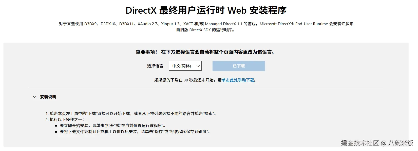 访问微软DirectX下载页,下载对应的dxwebsetup.exe(1.2MB),运行后接受许可协议取消勾选"安装Bing工具栏"等附加选项,等待组件下载(约80MB)并完成安装