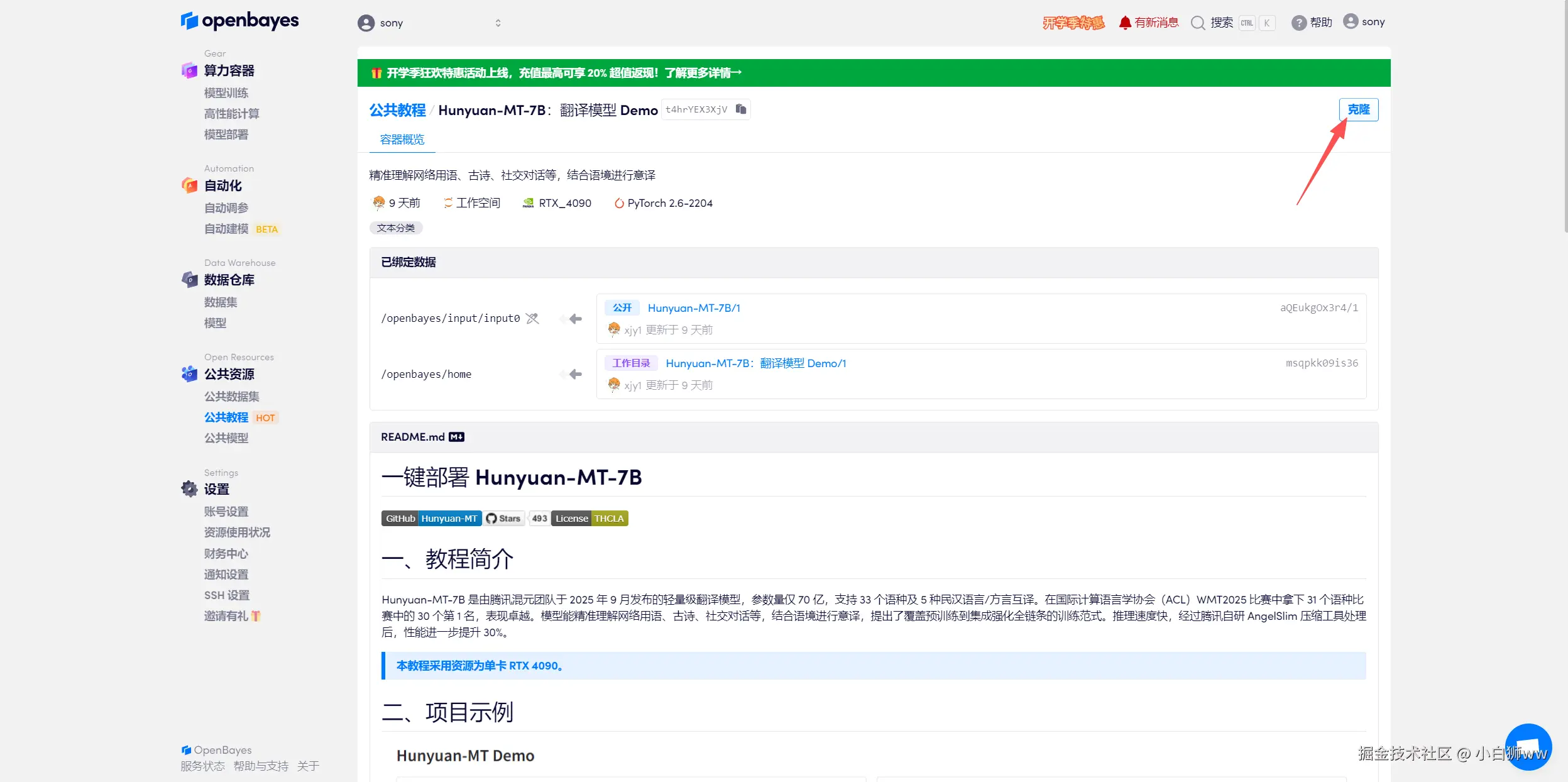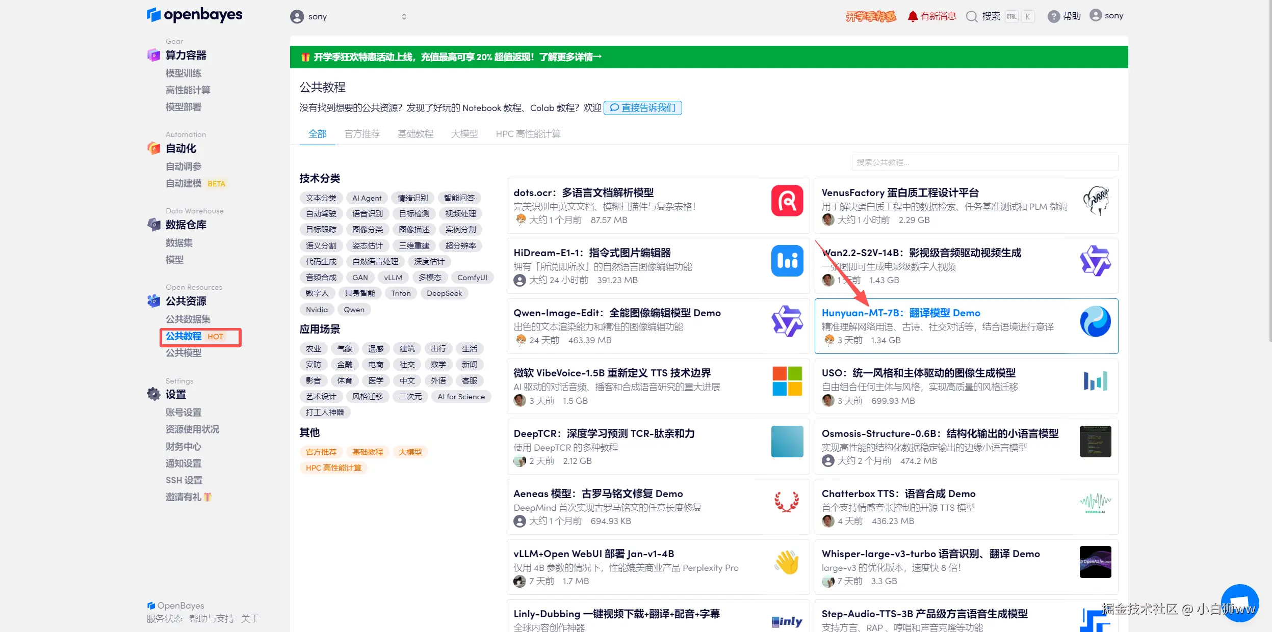 登录首先点击「公共教程」,在公共教程中找到「Hunyuan-MT-7B:翻译模型 Demo」教程。