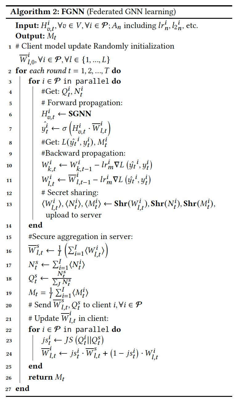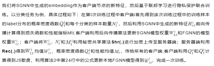 (2)FedaratedGNN learning(FGNN):客户端将(1)中得到的embedding作为新的节点特征,利用联邦学习算法,进行隐私保护的联合训练;利用JS散度优化联邦学习中的Non-IID数据集问题。