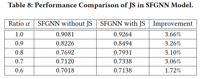 在Cora数据集上分别比较采用JS散度和不采用JS散度对模型性能的影响,如Table8所示,JS散度提升了模型性能,并提升效果随着分布不均匀性程度的增加而增加。