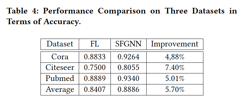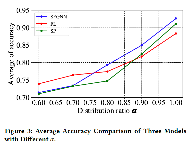 针对4.1中构造的Non-IID数据集,针对α=1.0的情况,我们比较了联邦学习模型和SFGNN在三个数据集上的准确率,如Table4所示,本文模型在三个数据集上的准确率均高于联邦学习模型,平均准确率提升5.7%.