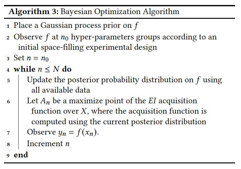 贝叶斯优化算法是一种解决黑箱问题的有效算法。我们将模型的超参调试过程作为一个黑箱问题,即黑箱的输入为超参数的不同组合,黑箱的输出为模型的性能,贝叶斯优化算法可以表示为: