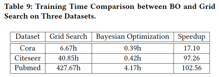 我们利用SMAC3框架中的贝叶斯优化算法对SFGNN进行超参优化,对比GridSearch方法,得到相应的训练时间,如Table9所示。