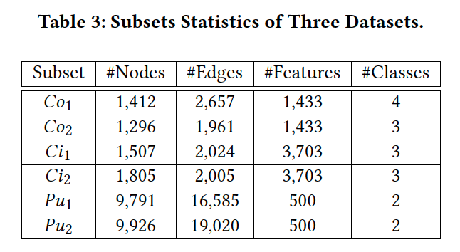 假设参与训练的客户端有两方分别为A和B。数据集选取Cora,Pubmed,andCiteseer三个常用的GNN分类数据集,根据label将数据集拆分成两部分N1和N2,两部分之间的数据不重叠,三个数据集对应的拆分结果如Table3所示。