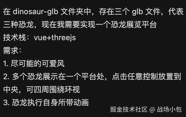 前段时间,包使用某款工具做了一个小米 su7 的 3d 展示平台,让小包也体验了一下, su7 车主的尊贵生活。那这次不如咱们就试试,使用文心快码 3.5S 做一个恐龙乐园,让弟弟看个够。