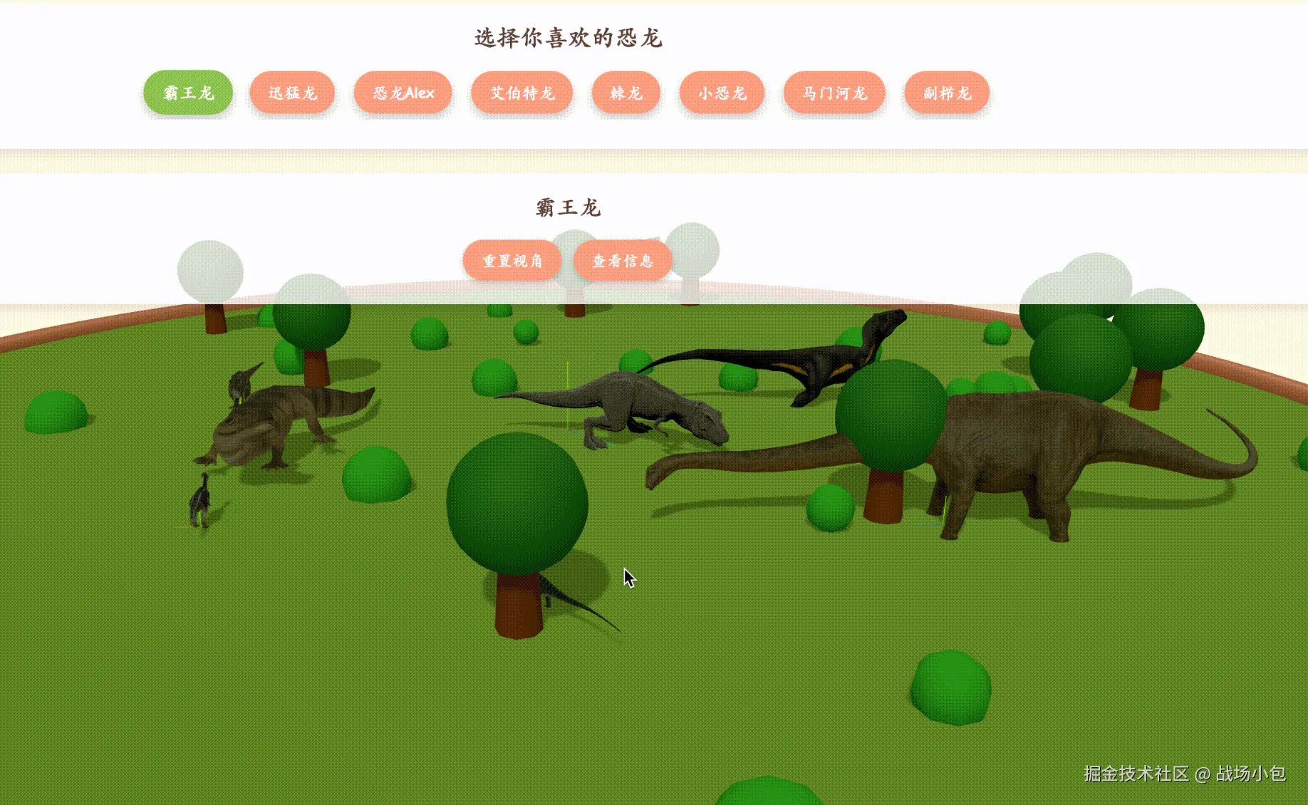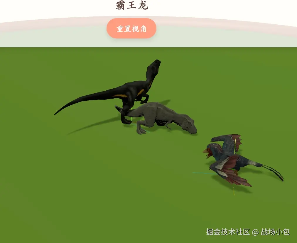 - 点击选择xxx龙按钮没反应(这里其实并没问题,迅猛龙的模型过大,导致挡住了其他两个模型)